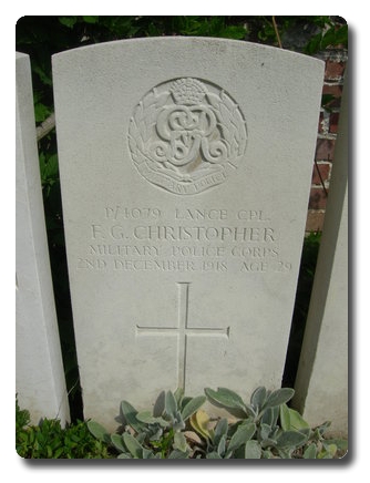 | Notes: | MFP. Awarded the Victory and War Medals. First served abroad (1) France, 12/4/1917 to 2/12/1918. He was born, enlisted and resided in Bristol. Died. No inscription on gravestone. Shown as attached to Railway transport Office, Died of Pneumonia. Info from pension card: Frank Christopher, died date not known, widow Jessie Lena Christopher, 2 Mill Pond Avenue, Fox Road, Bristol. Info from Army Register of Soldiers Effects 1901-1929. 9/8/1919 he left his widow Jessie the sum of 15/10d. 28/4/1919 he left her a further £26/5/11. Info from Pension Index Cards:- W/93, SB.36-W. WIDOWS. Widow Christopher, Jessie Lena, Husband, Christopher, Frank MFP, P/4079, L/Cpl, 2 Millpond Avenue, Fox Road, Bristol. Also:- MPW1. 8/W/993, 8/APW/219. Christopher, Mrs, Jessie l, 2 Millpond Avenue, Mina Road, Bristol, man's name, Christopher, Frank, MFP, L/Cpl, P/4079. Francis George Christopher. |