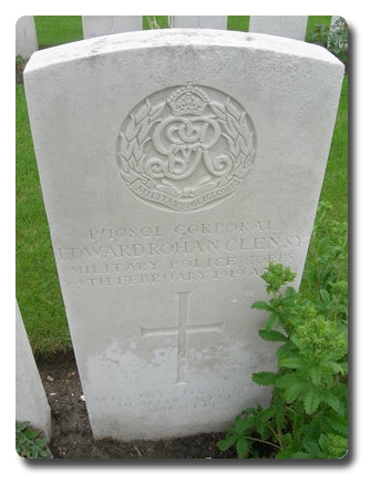 | Notes: | MMP. Awarded the Victory and War Medals. First served abroad (1) France, 29/6/17. He was born in Liverpool, enlisted in London and resided in Chelsea. Died. Formerly Pte. Durham Light Infantry. No. 6292. Inscription on gravestone: After life's fitful fever he sleeps well, Shakespear. Died at 30 General Hospital, Calais, of influenza, he left £29.15.4 to his widow Ellen. Army Register of Soldiers' Effects, 1901-1929. Widows' Pension: 24/2/1919 died from influenza contracted on active service in France. Name and address of Widow: Mrs Helen Mar Clensy, born 28/7/1869, address: 35 Great Queen Street, Kingsway, London WC2, 20/8/1919 she received a pension of 15/- per week. Also:- 99. Clensy, Helen Mary, 35 Great Queen Street, Kingsway, London W C, P/10801, L/Cpl, E R Clensy, MMP> Extract from the Gloucestershire Echo 26 February 1919. HELEN MAR'S HUSBAND DEAD. The Press Association states that Miss Helen Mar, the well known concert artist on Wednesday received information that her husband Mr Rohan Clensy, had died at Calais from influenza after a short illness. Mr Clensy who was an actor by profession was in the Military Mounted Police for two years. He had just been demobilised, and was about to resume his profession. |