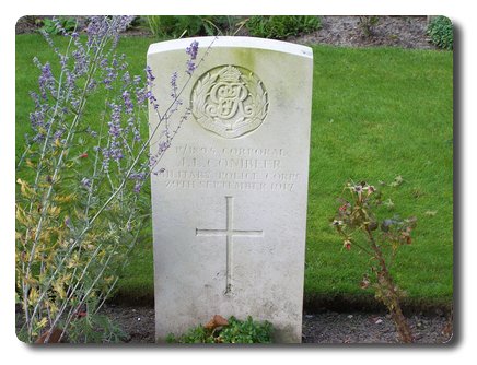 | Notes: | MMP. Awarded the 1915 Star, Victory and War Medals. 29/9/1917 Died. First served abroad (1) France 15/8/15 to 28/9/17. He was born and resided in Williton and enlisted in London. Died of Wounds. His name is spelt Combeer in Soldiers Died. No inscription on gravestone. He enlisted age 20 years, occupation Police Constable, home address: North Street, Williton, Somerset. 18/8/15 Rouen, 25/8/15 Guards Division, 22/12/15 Cavalry Base, Rouen, 11/1/16 2 Army, 31/1/16 3 Division, 2 Army. Info from Army Register of Soldiers' Effects, 1901-1929. 30/9/1917 KIA, 13/6/1918 his widow Mary received £5-06-04, 21/6/1919 she received £9-10-00 war gratuity. Info from Pension Index Card:- Conibeer, James Layman, No. P/1895, MMP, Dependant Mrs Mary Conibeer, Mother, North Street, Williton, Somerset. 3/6d per week, article 21 (ic) 6/11/1918 for life. James Layman Conibeer. James Layman Conibeer. |
