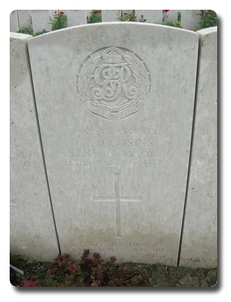 | Notes: | MFP. Awarded the 1915 Star, Victory and War Medals. First served abroad (1) France, 15/8/1915 to 12/4/1918. Formerly Pte. 2/3 London Company, Royal Army Medical Corps. No.2599. He was born and resided in Edmonton and enlisted in Chelsea. Died of wounds. Inscription on gravestone: Greater love has not man than this. Info from Army Register of Soldiers' Effects 1901-1929. 18/4/1918 died in the field. He had a debit balance of £5-12-05, 22/12/1919 dependant May Cousins received £14 war gratuity. Info from Pension Index Cards:- Cousins, Cyril Frank, No. P/5147, MFP, L/Cpl, DIED,18/4/1918, dependant Mrs May J Cousins, mother, 7 Sunnyside Road, South Edmonton, London. Cyril Frank Cousins. |