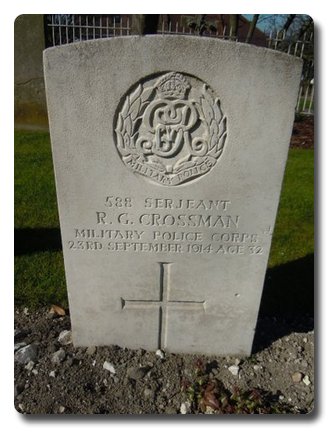 | Notes: | MMP. He was born at St. Luke's, London, enlisted in London and resided in Farnborough. Died of wounds. First BEF casualty to die of wounds in the UK. Awarded the 1914 Star, the Victory and War Medals. First served abroad (1) France, 13/8/1914 to 19/9/1914. Serving with 1 Division. He was born in London, enlisted 6/9/00, occupation French Polisher. No inscription on gravestone. Info from Army Register of Soldiers' Effects 1901-1929. died Military Hospital Fort Pitt, Kent, He has 2 x medal cards L G Crossman Victory and War Medals. and 2 x R G Crossman 1914 Star both with same details. Enlisted in the 1 Royal Dragoons, No. 4994, 6/9/1900. He transferred to the 8 Hussars, No. 6265 30/11/1903 to join his brother. Born St Lukes, Middlesex, occupation French Polisher. Served Home 6/9/1900 to 5/8/1901, South Africa 6/8/1901 to 25/9/1902, Home 26/9/1902 to 19/5/1905, Egypt 20/5/1905 to 23/3/1911, Home 24/3/1911 to 14/8/1914, BEF 15/8/1914 to 19/9/1914, Home 20/9/1914. Transferred to MMP 15/10/1904. Died at Fort Pitt Hospital, Chatham from wounds received in action serving with the Exp Force, admitted 21/9/1914, died 23/9/1914, Shell wound developed tetanus. Strange his has no clasp to 1914 star and died of wounds. Initials R G Richard George, initials on medal roll page B858 shown as L G Entry in De Ruvigny's Roll of Honour, Volume 3, page 68. CROSSMAN R G. Sergt. No. 588. Military Mounted Police, served with the Expeditionary Force in France. Died of Wounds 1914. Info from Pension Index Cards:- Crossman, Richard George, No. 588, MMP, Sgt, 23/9/1914 died of wounds received in action. Widow Alice Ada, born 2/1/1885, address: Malvern, Union Street, Farnborough, they had one child Jocelyn Alice Maud born 5/11/1912. 24/3/1915 his widow recerived 16/- per week pension. Richard George Crossman. Extract from the East Anglian Daily Times 28 October 1914. A further communique announces that Sergt. R G Crossman, Military Mounted Police, has died of wounds. |