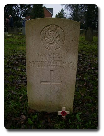 | Notes: | MMP. He was born at Oxford, enlisted at Epsom and resided in Burgh Heath. Died. Home. Age 40. He was born in Oxford, enlisted 4/11/14, occupation Gardener, died at Haselmere Cottage Hospital, Surrey after an accident, Army Register of Soldiers' Effects, 1901-1929. Info from Pension Index Cards:- Giles, Frederick John, P/500, MMP, L/Cpl, Case No. 5, WFJ.9, died 28/12/14 result of motor car accident whilst on picquet duty, Widow, Mrs Helen Elizabeth Giles born 19/4/64, Farm Cottage, Canon Lane, Burg Heath, Surrey, child Albert Edward, born 14/12/06, pension 20/- pw from 29/6/15, awarded 11/6/15. Also:- Giles, Helen Elizabeth, 5, Farm Cottage, Canon Lane, Burg Heath, Surrey. P/500, L/Cpl. John Frederick Giles, MMP. Frederick John Giles. Extract from the Bradford Daily Telegraph 29 December 1914. MILITARY PICKET RUN DOWN - SIX MEN INJURED. A military picket were the victims of a serious accident at Haselmere on Sunday night. They were run into by a motor car and Frederick Giles, of the Military Mounted Police, one of six men knocked down, died yesterday morning from his injuries. The picket consisted of nineteen men. They were proceeding along the road;. The six rear men were knocked down, and Giles was hurt about the head. An operation was performed but he died at 4am. Of the other men injured three are now in the military hospital at Bramshott. The driver of the car has been detained by the police. Extract from the West Sussex Gazette 31 December 1914. HASLEMERE. SERIOUS MOTOR ACCIDENT. FATAL INJURIES TO A SOLDIER. DRIVER ARRESTED FOR MANSLAUGHTER. A serious accident took place in Haslemere on Sunday night, when a military picket patrolling Station Road, which is one of the principal streets of the town, was run into by a motor car and Corporal Frederick Giles, one of six men who were knocked down, was so badly hurt that he afterwards died in the Haslemere Cottage Hospital. The picket consisted of 17 men of the Royal Scots Fusiliers (now in Bramshott camp) under the charge of Sergeant Joseph Murphy, with two members of the Haslemere staff of Military Mounted Police and they were proceeding along the Station Road in the direction of the railway station, when they were run into from behind by a large Wolseley mot car driven by Eric Henry Hades, of Pitfold Farm, Shottermill. It was about a quarter to eight in the evening when people were returning from church and there were, therefore many witnesses of the occurrence. The six men waling in the rear were all knocked down and Corporal Giles, who was badly hurt about the head, was taken in the car to the Cottage Hospital, where he was detained, although, after being examined by a doctor, he expressed a with to return home. He was, however, put to bed and during the night a change was noticed in his condition. An operation was performed by Drs. Hutchinson and Winstanley, but the man died shortly after four o'clock on Monday morning, death being due to a fracture of the base of the skull. The other men were all more or less injured and three of them are now in the military hospital at Bramshott. The driver of the car, Eric Henry Hides, who is the owner of the local garage, was arrested at half past nine on Monday morning and charged with manslaughter. Later in the day he was conveyed to the police station at Godalming. The Coroner (Mr. Gilbert White) was communicated with and the inques5t was arranged to take place yesterday (Wednesday). |