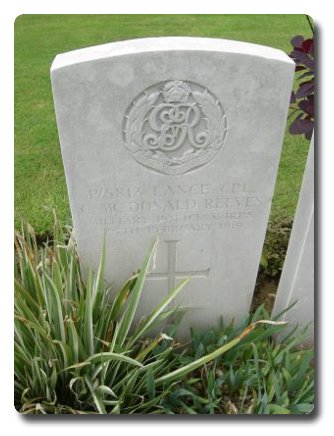 Notes: | MFP. Awarded the Victory and War Medals. First served abroad (1) France, 13/3/1917, returned (1743 KR, 1912) 8202/adj.. He was born in Aberdeen, enlisted in London and resided in Tonbridge (shown as Ashford in CWGC roll). Died, illness, Boulogne, he left £26.2.9 to his widow Elizabeth. Army Register of Soldiers' Effects, 1901-1929. Formerly 3 Gordon Highlanders in Aberdeen in 1915 and transferred to MFP 12/1916. No inscription on gravestone. Info from 3 x Pension Index Cards: Reeves, Charles McDonald, No. P/5813, MFP, L/Cpl, 25/2/1919 died from bronco pneumonia contracted on active service. Widow Elizabeth, born 2/12/1881, 1 Bordyke, Tonbridge, Kent, they had 1 x child Macdonald Sydney B Reeves born 27/9/1913. 8/3/1919 widow received £6 grant, 1/9/9/19 a pension of 22/9 per week. Charles McDonald Reeves. |