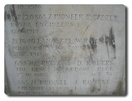 Notes: | MFP. Awarded the 1914 Star, Victory and War Medals. First served abroad (1) France, 21/8/1914 to 12/10/1914 and (2a) Salonika 3/1/16 to 12/8/1918. He was born in Wrexham, enlisted in Woolwich and resided in Fulham. 19/10/1898 he enlisted as a Pte in the Duke of Cornwall's Light Infantry. No. G/5665 and 3/3665, age 19.6 years, occupation Carman, Born Wrexham, Wales, address: Mother, 37 Nott Street, Deptford, Kent, 7/5/1902 DCM for desertion and loss of kit awarded 56 days imprisonment with hard labour, 22/4/1902 DCM for desertion, AWOL FROM 16/10/1906 TO 25/10/1906 Awarded 98 days detention, 30/1/1907 discharged. 31/1/1920 Elects to have former service forfeited on conviction of desertion 1 year, 364 days, 19/10/1898 to 1/11/1899 and 4/5/1902 to 21/4/1905. Served Home 19/10/1898 to 27/5/1902, South Africa 28/5/1902 to 17/2/1903, Home 18/2/1903 to 21/4/1903, Home 25/10/1906 to 22/2/1907, Gibraltar 23/2/1907 to 2/9/1907, Bermuda 3/9/1907 to 19/1/1910, South Africa 20/1/1910 to 5/4/1910, Home 6/4/1910 to 20/8/1914, BEF 21/8/1914 to 12/10/1914, Home 13/10/1914 to 2/1/1916, Salonika 3/1/1916 to 12/8/1918, Home 13/8/1918 to 25/8/1918. 1/7/1912 charged with being drunk at Lambeth, fined 21/- or 7 days prison, he served 7 days in HMP Wandsworth. 15/9/1914 he suffered a GSW to chest, severe, casualty list A36, No. 647, 1/10/1918 transferred to MFP, 17/8/1918 died from TB. Letter in Army Record from Poor Law Hospital, Stepping Hill, Hazelgrove, Nr Stockport. August 21st 1918, L/Cpl, Roberts, Wm, 7640, MFP, Age 40. The above named patient was admitted to the above Hospital on August 13th 1918, with Pulmonary Tuberculosis. he was extremely weak, had night sweats, cough and spat u large quantities of sputum. on the 17th August 1918 he began to have Cerebral Haemorrhage and died on August 20th 1918 from Apoplexy. He is shown in unclaimed deceased soldiers estates as having left £31-14-6p. LG 31527, page 10883, dated 29/8/1919. Info from 2 x Army Register of Soldiers' Effects, 1901-1929. 20/8/1918 died Military Hospital Stockport. No date he left £31-04-06, and £23-10-00 war gratuity. William Roberts. |