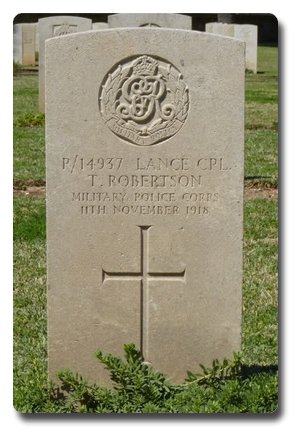 Notes: | MFP. Awarded the Victory and War Medals. First served abroad (3) Egypt, 20/1/17 to 11/11/18. Formerly Pte. 1/7 Northumberland Fusiliers. No. 292578 (shown as No. 6952 in soldiers died). He was born in Clerkenwell, enlisted and resided in Stepney. Died. Shown as having died in Egypt in soldiers died. Died on day war ended. Died, illness, 33 Casualty Clearing Station, Haifa, Palestine, Army Register of Soldiers' Effects, 1901-1929. Info from Pension Index Cards: Robertson, Thomas, No. P/4937, MFP, L/Cpl. 11/11/1918 died from pneumonia contracted on active service. Widow, Fanny, 44 Latimer Street, Stepney, London they had one child Dorothy Escott, born 13/3/1910. 4/12/1918 she received a grant of £6 and 19/5/1919 she received 20/5 per week pension. He died on the day war ended. Also:- Robertson, Fanny, 90, 44 Latimer Street, Stepney, London, P/14937, L/Cpl, J Robertson, MFP. Thomas Robertson. |