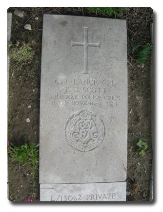 Notes: | MMP. Awarded the 1914 Star, Victory and War Medals. First served abroad (1) France, 15/8/1914. He was born in Finchley, enlisted in London and resided in Whetstone. Died of Wounds. Formerly served in the Royal Horse Guards, No. 812. No inscription on gravestone. He was born in Finchley, London, enlisted 27/2/00, occupation Traveller, Army Register of Soldiers' Effects, 1901-1929. 1911 serving in Egypt. 1911 Census serving in Abdin Barracks, Cario, Egypt. Thomas Oliver Scott. |