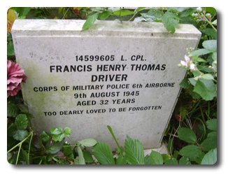 | Notes: | CMP. He was born and resided in London WC. 6 Airborne Division Provost Company War diary WO 166/17781. 9/8/1945 22.30 hrs. L/Cpl Driver F killed in a motorcycle accident in Bishopstone, Nr Salisbury. 17/8/45 OC & 6 NCO's attended L/Cpl Drivers funeral. Casualty List 1835, Home, died as result of accident, 9/8/9145. Medal card not found. Francis Henry Thomas Driver. |