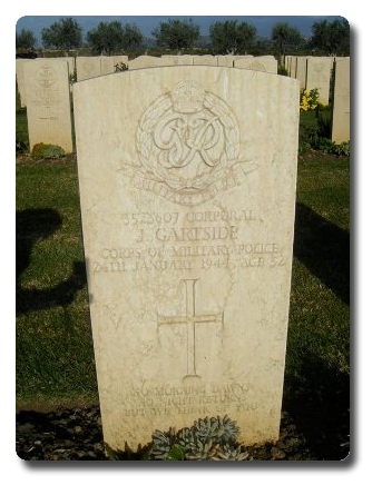 | Notes: | CMP. Enlisted in the Royal Armoured Corps then Manchester Regiment, then CMP. BNAF. 24/2/44 Died. He was born in Oldham and resided in Lancashire. Shown as MPSC in soldiers died. Accidentally killed. Inscription on gravestone: No morning dawns, no night returns but we think of You. Casualty List 1388/16, Sicily, missing believed killed, 24/2/44. Casualty List 1395/20, Sicily, previously reported missing believed killed 24/2/44 now reported killed in action. previous list 1388, 24/2/44. Medal card not found. John Gartside. |