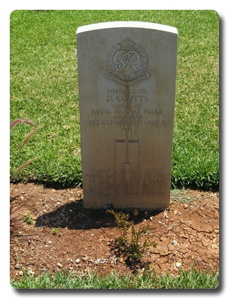 | Notes: | RMP. 6 Airborne Div Pro Coy. 31/10/47 Died. Inscription on gravestone: Where is death's sting? where, grave, thy victory? in life , in death, O Lord abide with me. No Casualty List found. Medal card not found. David Coutts. |