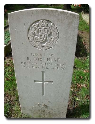 | Notes: | MFP. Awarded the 1915 Star, Victory and War Medals. First served abroad (1) France, 8/12/1914 to 11/7/15. Not listed in soldiers died. Served under the name of Heap. He was from York. No inscription on gravestone. He enlisted 21/10/1914. Previously served in the East Yorkshire Regiment for 3 years and was discharged by purchase. Born Kimberworth, Nr. Rotherham. Age on enlistment 26, occupation Joiner. Served Home 21/10/1914 to 7/12/1914, France 8/12/1914 to 11/7/1915, Home 12/7/1915 to 8/8/1915. Discharged no longer physically fit for Military Service. Army Registers of Soldiers' Effects: Died 9/5/18 after discharge, Pte. 12/6/1918. His widow Lucy received £14-03-09 2/122/1919 received £3-3-4 and 11-3-1919 £6-6-8. Home address of wife: 14 Alderney Road, Heeley. Sheffield. Address on discharge 22 Brunswick Street, York. Died from Tuberculosis. Info from Pension Index Cards: Heap, Robert Cox, No. P/366, MFP, L/Cpl, 8/8/1915 discharged, 19/5/1918 died from tuberculosis aggravated by active service. Widow Annie Cox, born 2/1/1893, 22 Brunswick Street, The Mount, York. They had 1 child Barbra born 2/2/1915. 10/7/1918 widow awarded £6 grant and 20/8/1915 she received 22/9/ per week pension. Also:- SB.36-APW. 4/APW/3992. Widow Heap, Annie, Husband Heap, Robert Cox, MFP, P/366, L/Cpl, born 1893, 23 Brunswick Street, York, 2/9/18 widow awarded £1-2-9 14/8/18 and £1-16-5. 3/9/18. Robert Cox-Heap. |