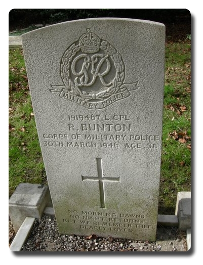| Notes: | CMP. 1/2/1940 he enlisted in the Royal Engineers, age 34 years, born 5/1/1908, 18/6/1943 transferred to CMP. No Casualty List found. Inscription on gravestone: No morning dawns, no night returns, but we remember three. Ronald Bunton |