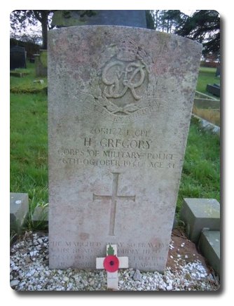 | Notes: | CMP. He enlisted in the Royal Army Service Corps, transferred to CMP. 18/6/46 to discharge. Casualty List 1404/13, Italy, Wounded, 12/3/1944. He was awarded the 1939-1945 Star, Africa Star, War Medal. Address:- Not shown. Inscription on gravestone: he marched away so bravely, his head so proudly held, his footsteps never faltered, his courage never failed He was awarded the 1939-1945 Star, Africa Star, War Medal. Address:-. Not given. Harry Gregory. |