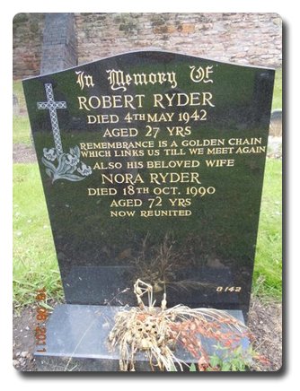 Notes: | CMP. VP. Enlisted Auxiliary Military Pioneer Corps, 3/5/41 transferred to CMP. 22/3/42 discharged. 4/5/42 died. Not listed in Crozier or Army Roll of Honour. Inscription on private gravestone: In memory of Robert Ryder, died 4th |May 1942, age 27 years. Remembrance is a golden chain which links us till we meet again. Also his beloved wife \Nora Ryder, died 18th October 1990, age 72 years. Now Re-united. Robert Rider. |
