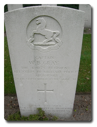 | Notes: | CMP. RSM 1 Airborne Division Pro Coy. London Gazette 36225, page 4760, 20/10/43. The undermentioned to be granted immediate emergency commissions from the ranks in the rank of 19/6/43. Kings Regt. 2/Lt. (7260742) WOI William Buchanan Grey (282969) from CMP (shown as RAMC in gazette). Later Capt. He was a born in Plymouth and resided in Berkshire. Pegasus Patrol page 132 & 133. "Wounded in ambush on way to river and died of wounds". He was the OC 1 Airborne Division Pro Coy and previously served as RSM. OC PRO COY. Inscription on gravestone: Thank you Jock for the wonderful memories of our love and Happiness Dot. War Diary WO 171/407 1 Airborne Division Pro Coy. 26/9/44. D+ 9 Capt Grey received wounds from which he has died. Only one got across the river out of 5 Officers and 66 other ranks who too part 1 Officer, and 11 other ranks returned. Casualty List 1572, North West Europe, Missing, King's Regiment, date not reported. Casualty List 1611, Western Europe, Previously reported missing now died of wounds. William Buchanan Gray. |