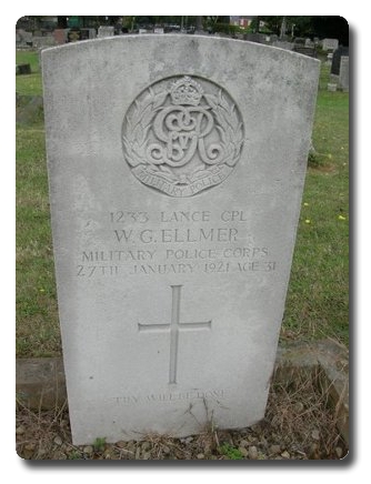| Notes: | MFP. Not listed in soldiers died. Inscription on gravestone: Thy will be done. Same number as Sgt H Newlands MMP. Awarded the Victory and War Medals. First served abroad (1) France, 4/4/1918. Info from Pension Record. Enlisted in the Lincolnshire Regiment, No. 8342, age 18 years on 8/1/1908. Transferred to MFP 19/3/1913. Served Home, 3/1/1908 to 27/12/1911, Gibraltar 28/12/1911 to 8/2/1918, Home, 9/2/1918 to 3/4/1918, BEF, 4/4/1918 to 20/12/1918, Home, 21/12/1918 to 17/5/1919. Home address on discharge, 5 Chapel St. Ashby, Scunthorpe, Lincs. Reason for discharge, Mental instability. Info from Pension Index Cards:- Region East Midlands 14/3/21. DEPENDANT'S PENION. D1. Ellmer, Walter Greenwood, 1233, MFP, L/Cpl. 7/DP/4168, SN.1673, Dependant: George Ellmer, 5 Chaple Street, Ashby, Scunthorpe, Lincs, relationship Father, 22/1/35. Also:- SB36. 7/ME/92. Deceased. Ellmer, Walter Greenwood, MFP, 1233, 17/5/19 to discharge, born 1887, single, 5 Chaple Street, Ashbury, Scunthorpe, Lincs, disability mental instability, attr. Also:- SB36-D. Ellmer Walter Greenwood, MFP, 1233, L/Cpl, single, DIED 27/1/21 General Paralysis, after discharge. Claimant: Ellmer, Mrs, Francis Harriet, 5 Chaple Street, Ashby, Scunthorpe, Lincs, Mother, 5/- 21 (16) from 28/1/21. Also:- Ellmer, Walter Greenwood, MFP, 1233, Lincolnshire Regt, 17/5/19 to discharge, 7/ME/92, SFJ.2491, 5 Chaple Street, Ashby, Scunthorpe, Lincs. Stamp: Ad 2/6/19 at 15/- from 18/5/19 to 18/11/19, Chelsea No. MVO.2285, received 3/5/19. Walter Greenwood Ellmer. He has the same No. as Sgt H Newland, MMP and RSM J H Troughton, MPSC. |