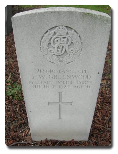 | Notes: | MFP. Awarded the Victory and War Medals. First served abroad (1) France, 9/12/1916 to 11/3/1917. Not listed in Soldiers Died. Formerly Pte. 1/4 Kings Own Yorkshire Light Infantry. No. 204011. No inscription on gravestone. Info from pension index cards:- 4/MG/1733. Greenwood, Frederick William, MFP, P/13340, L/Cpl, 6/5/19 to discharged, born 1880, married, 65 Belvoir Street, Hull. Card stamped Dormant no other details. Also:- W.1. DEAD 2/7/31, Greenwood, Frederick William, P/13340, MFP, L/Cpl, 8/6/21 DIED, Widow Esther Mary, 65 Belvoir Street, Hull born 11/4/79. 26/7/21 she received a grant of £8. Also:- Greenwood, Frederick W, DIED 8/6/21, MFP, P/13340, KOYLI, East Riding Yeo, Yorkshire Yeo, 6/5/19 to discharge, SFJ.2760, 4/MG/1733, Stamp: Ad 7/5/19 at 13/- from 7/5/19 to 3/2/20, Chelsea no. Z/Misc/MFP/1558, received 8/5/19. File Destroyed 23/10/28. Frederick William Greenwood. |