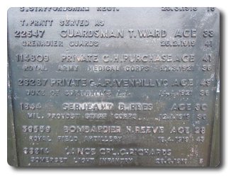 Notes: | MPSC. 12/1/1919 Died. Awarded the 1914 Star, Victory and War Medals. First Served abroad (1) France, 24/8/14. He was born and enlisted in Birmingham and formerly served as a Pte. Royal Warwickshire Regiment, No. 794. Information from service record: He enlisted in the Royal Warwickshire Regiment 14/3/06 and formerly served in the 6 Worcestershire Regiment and the Militia. Served Home 14/3/05 to 21/8/14, BEF 22/8/14 to 30/10/14 (wounded in stomach), Home 31/10/14 to 12/1/19. Transferred to MFP 4/7/17. Home address: 69 Russell Street, Birmingham. His wife and 4 children received a pension of 36/3d per week. He was a Warden at the detention barracks, Stafford and resided in Lodgings at 2 George Street, Stafford. He was found dean in bed with another man William Vann. An inquest was held jointly on the two men. The inquest found that he had died through suffocation by burying his face in the pillow during a post-epileptic sleep Vann was thought to have died of a heart attack on waking up and seeing Rees having a fit. Benjamin Rees. |