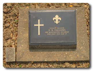 | Notes: | CMP. POW. Formerly Manchester Regiment, shown as L of C Pro Coy in Cutts papers. Captured 15/2/1942 Singapore. Shown as a Private in Manchester Regiment in CWGC Roll but listed as L/Cpl died up country L of C Pro Coy in Cutts papers. He was born in Salford and resided in Manchester. Information from Japanese POW Index Card: Ernest Fallows. Born 23/5/1915, 10 Old Street, Ardwick, occupation Warehouse man, home address: Sarah Fallows, 1 Old Street, Ardwick, Manchester father Dale John Henry, mother Alma. He is shown on British POW's held in Japan and Japanese Occupied Territory: 16216, Fallows, Ernest B, L/cpl, 3534659, Army, captured 15/2/1942, died 5/7/1943, camp TH, Thailand, Deceased. He is listed on Thailand POW Camp List 1/11/1944: Fallows, Ernest, Army, L/Cpl, new POW No. IV 6378, old POW No. IV 5872, previous camp M2390, 3534659,D-18/7/5. He is shown in a list for British 4 Group (working party). He is listed in the Upper Kanyu No.3 Cemetery Register grave 14, died 5/7/1943 from Cholera. Casualty List 778/12, Malaya, 1 Manchester Regt. Missing, 15/2/42. Casualty List 1208/9, Malaya, previously reported missing now reported POW, previous List 778, 15/2/42. Casualty List 1786/32, POW, previously reported POW in Japanese hands now reported died, 1 Manchester Regt. previous list 1208, Malaya. Ernest Ben Fallows. |