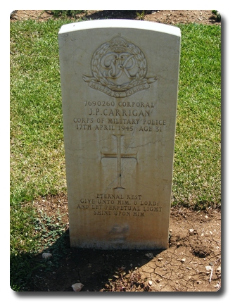 | Notes: | CMP. Enlisted into CMP. He was born in Bradford and resided in Leeds. Casualty List 1751/1, Middle Wast, Died, date not reported, CL 1782/40. Casualty List 1782/40, List 1751, Middle East, casualty should read died as a result of an accident. 17/4/1945. 28/7/48 He was awarded the 1939-1945 Star, Africa Star, Italy Star, Defence Medal, War Medal, MID. Address:- Not shown. James Patrick Carrigan. |