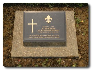 | Notes: | POW. He enlisted in the 1 Manchester Regiment, attached to L of C Pro Coy, CMP in Cutts papers. He was born in London SE and resided in Essex. Captured 15/2/42 Singapore. Shown as died up-country in Cutts papers. He is listed as Manchester Regiment in CWGC roll. Info from Japanese POW index card: Albert Edwards. Born 8/11/1904 at 55 Sterry Road, Dagenham, Essex, occupation Printer, home address: 55 Sterry Road, Dagenham, Essex. Unit Corps of Military Police on this card. He is shown in a list for British 4 Group (working party). He is listed on British POW's held in Japan or Japanese Occupied Territory: 15224, 3535877, Army, captured 15/2/1942, died 19/6/1943, camp TH, Thailand. He is listed on Thailand POW Camp List, 1/11/1944: Edwards, Albert, Army, L/Cpl, new POW No. IV6116, old POW No. IV5831, camp M-2595, 3535877, D-18/6/19. Casualty List 778/12, Malaya, Missing, 15/23/1944, shown on 1 Manchester Regiment List. Casualty List 1847/2, Malaya, previously reported Missing 15/2/1942 now reported Died whilst POW, previous List 778, 19/6/1943, shown on 1 Manchester Regiment List. Medal card not found. Albert Edwards. |