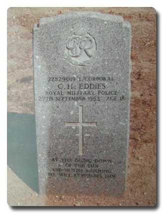 | Notes: | RMP. Died 27/9/1953. Cause of death road traffic accident, near Nicosia, Cyprus. Age 18. Inscription on gravestone: At the going down of the sun and in the morning we will remember him. Grave Reference: Plot 17 Row C Grave 5. Born 6/10/1934. Colin Herbert Eddies. |