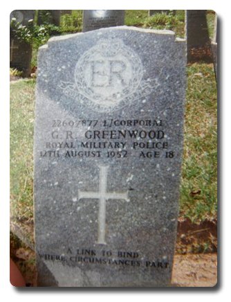 | Notes: | RMP. Died 12/8/1952. Cause of death accident, Singapore. Age 18. Inscription on gravestone: A link to bind where circumstances part. Grave Reference: Plot 2 Row D Grave 7. Born 21/9/1933, Garry Robertshaw Greenwood. Extract from the Nelson Leader 9/1/53. Lance Corporal Garry Robertshaw Greenwood: who was to have celebrated his 195h birthday the following month, died as a result of a fall, whilst serving as a military policeman in Singapore. his home address was 13 Messenger Street, Nelson |
