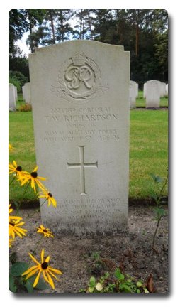 Notes: | RMP. Died 13/4/1952. Cause of death field training accident, Germany. Age 26. Inscription on gravestone: Jesus lives by this we know, that thou of grave can't not enthral us. Hallelujah. Grave Reference: Post War Plot Row E Grave 22. Born 13/8/1925. Thomas William Richardson. |