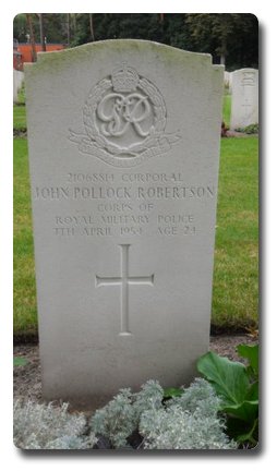 Notes: | RMP. Died 7/4/1954. Cause of death traffic accident, Berlin. Age 24. Grave Reference: Plot Row A Grave 19. Born 28/9/1929. John Pollock Robertson. |