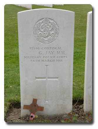 | Notes: | MFP. Died of wounds. He was born in Hackney, enlisted in Aldershot and resided in Holloway. No inscription on gravestone. Awarded the 1914 Star, Victory and War Medals. First Served abroad (1) France, 1/11/1914 to 23/3/18. Info from Pension Index Cards:- 45. Jay, Rosina, 24 Devonshire Road, Holloway, London N 7, P/416 A/Cpl, George Jay, MFP. Also:- W1. Jay, George, P/416,MFP, A/Cpl, 24/3/18 died of wounds Widow, Rosina, 24 Devonshire Road Holloway London N 7.1933 DEAD 12/2/34, MJ.8194, 18/4/18 widow awarded £5 grant. Children Gladys Maud Jay, born 22/4/05, Doris Isabel Jay, born, 13/4/09 Irene Winifred Jay, born 19/9/11, Kathleen Vera Jay, born 14/4/17, 14/10/18 widow awarded 35/- per week pension. In March 1918, No.3 Traffic Control Company was based in or near Ypres. On 24th March 1918 george was morally wounded in action, and died the same day. Sadly, the circumstances of his death were not recorded. On 26th March, Captain Norman Kirby Peace, MC, wrote to Rosina (Cpl Jay's wife). My dear Madam It is with the most profound regret that I have to transmit to you the unhappy news that your husband ws most serverly wounded about midday on thel24th inst. & succumbed to his wounds about two hours later. I feel his loss very severly for, not only by myself, but by everyone who came in touch with him, he eas regarded as the very esence of courage and devotion. he joiuned by company a year ago, and during that time by his untiring devotion to duty and his fealess bravery, he carried with him the men under him, and won the confidence and deepest respect of his officers. He was buriefd yesterday, in a little field cemetery close to the spot where he fell and with the full honours of a brave soldier. I wish to extend to you my very deepest sympathy and condolences in this terrible bereavement, and to assure your that he was a man most beloved. Yours sincerely N.K.Peace Capt. Commdg, No. 3 Traffic Control Coy, |