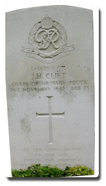 | Notes: | CMP. POW. He was born in Dudley and resided in Worcestershire and formerly served in the Royal Artillery, 10/4/1937 transferred to CMP. Captured 25/12/1941, Hong Kong. 25/12/1941 casualty lists 706 to 721, Hong Kong, Missing. Died from chronic enteritis. Inscription on gravestone: At the going down of the sun and in the morning we will remember him. Info from Japanese POW index card: John Henry Clift. Born 1/9/1917 in Dudley, home address: 17 Fern Road, Priory, Dudley, father William, mother Ethel. He is listed on British POW's held in Japan or Japanese occupied territory: 9880, Clift, John Henry, L/Cpl, 843639, Army, captured 15/2/1941, died 21/11/1942, camp, HK, Hong Kong, deceased. He his listed on unknown roll: Cliff, John Henry, army, L/Cpl, POW No. 3383, No. 843639, died 17/11/21 (21/11/1942. He is listed on Honk Kong death record: 377. Clift, John H, 843639, died 21/11/1942, from chronic enteritis and heart failure. British, L/Cpl, CMP. Casualty List 718,/10 Hong Kong, Missing, 25/12/1941. Casualty List 866/18, Hong Kong, POW previously reported missing on List 718, 25/12/1941. Casualty List 1201/21, POW, previously reported POW now reported Died, date of death not reported. Casualty List 1377/31, Corrections, List 1201/31, previously reported POW now reported Died, Hong Kong, 21/11/1942. 7/9/49 He was awarded the 1939-1945 Star, Pacific Star, Defence Medal, War Medal. Address:- Not shown. John Henry Clift. |