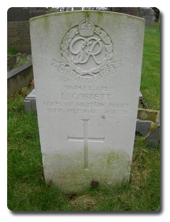 | Notes: | CMP. 16/12/1929 he enlisted in the Cavalry of the Line, 17/21 Lancers, age 19 years for 6/6 years, 13?2/1936 to Army Reserve, 3/11/1939 transferred to CMP. 30/7/41 Died. He was born in Yorkshire and resided in Leeds. Casualty List 589/15, Home, Died result of accident, 30/7/1941. Medal card not found, Inscription on gravestone: Treasured memories, until we meet again. He is listed in the GPO War Memorial Book Wakefield Area. Leonard Cobbett. |
