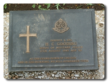 | Notes: | CMP. POW. Enlisted in to CMP. 18 Div Pro Coy. Formerly He was born in London E and resided in Essex. Captured Singapore, 15/2/19142. Died of Diarrhoea 17/8/1943 at Sonkrai, Thailand. Home Address: Mrs P Gooding, 29 Woodbridge Road, Barking, Essex. Information from Japanese POW index card: Horace Gooding. Born 30/3/18 at Barking, Essex, occupation Hair Dresser, unit 18 Div Pro Coy, home address: Phillis Gooding, 29 Woodbridge Road, Barking, Essex, father Frederick Herbert, mother Edith Elizabeth. He is listed on British POW's held in Japan or Japanese occupied territory: 19658, Gooding, Horace Charles, L/Cpl, 7690373, Army, captured 15/2/1942, died 17/8/1943, camp MA, Malaya (Thailand), deceased. He is listed on a Japanese Death Certificate: Gooding, Horace, Charles, L/Cpl, 7690373, cause of death Colitis, 17/8/1943, Buried. He is listed on Thailand Burma, Railway Camp List Force "F" & "H" Death Register: 81, 7690373, Gooding H, L/Cpl, 18 Div Pro Coy, died 20/10/1943 from diarrhoea, Sonkrai Cemetery 2, block B, Row 2, grave 1. He is listed on Force "F" Working Party List: Died 17/8/1943. Casualty List 793/19, Malaya, Missing, 15/2/1942. Casualty List 1142/17, Malaya, previously reported Missing now reported POW, previous List 793, 15/2/1942. Casualty List 1936/11, Malaya previously reported POW now reported Died, date of death 17/8/1943. 28/9/49 He was awarded the 1939 - 1945 Star, Pacific Star, War Medal. Address:- Not shown. Horace Charles Gooding. |