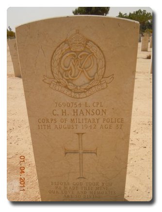 | Notes: | CMP. Enlisted in to CMP. He was born and resided in Birmingham. Inscription on gravestone: Before God took him he made thee mine, our love and memories are so divine. 113 Pro Coy War Diary WO 169/6652. 11/8/1942 Enemy bomber bombed Hamman, L/Cpl Hanson killed by shrapnel, L/Cpl Montgomery died later and Powell seriously injured. Casualty List 934/1, Middle East, Killed in Action, 12/8/1942. Medal card not found. Charles Henry Hanson. |