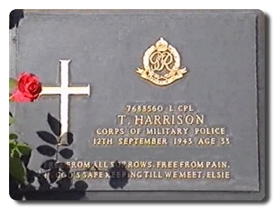 | Notes: | CMP. POW. 12/9/43 Died. He was born and resided in Leeds. 15/2/42 captured Singapore. Inscription on grave panel: Free from all sorrows, free from pain, in Gods's safe keeping until we meet again, Elsie. Cutts Papers, died from ulcers and dysentery. Info from Japanese POW index card: Thomas Harrison, born 19/3/1910, at 9 Hilloughoy Place, Leeds, Home address: Mrs Elsie Eileen Harrison, 62 Rose Avenue, Horsforth, Leeds. Father Thomas, mother Mary Jane. He is listed on British POW's held in Japan and Japanese Occupied Territory: 22424, Harrison, Thomas, L/Cpl, 7688560, Army, captured 15/2/1942, died 12/9/1943, camp MA, Malaya (Thailand), Deceased. He is listed on Malaya POW Camp List, 1/11/1944: Harrison, Thomas, Army, L/Cpl, new POW No. V 5360, old POW No. i/3267, 7688560, 12/9/18. He is listed on the Death Register Thailand Burma Railway Camps, Force "F" & Force "H": 79A, 7688560, Harrison T, L/Cpl, Provost Corps, died 12/9/1943 from dysentery and ulcers, grave E6, Tamarkand Village, Thailand, Force "H". Casualty List 767/16, Malaya, Missing, 15/2/1942. Casualty List 945/19, POW previously reported missing, previously shown on List 767 as missing 15/2/1942. Casualty List 1148/32, Malaya, now POW previously reported Missing on List 767, 15/2/1942. Casualty List 1913/12, previously reported POW now reported Died, 12/9/1943, previous List 945 corrected by 1148, Malaya. 12/8/85 He was awarded the 1939 - 1945 Star, Pacific Star, Defence Medal, War Medal. Address:- not shown. Thomas Harrison. |
