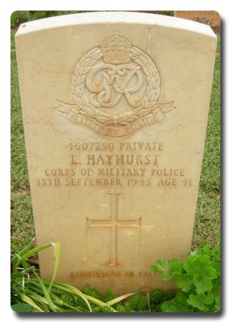 | Notes: | CMP. He was born in Bradford and resided in Leeds and formerly served in the Duke of Wellington's Regiment. War Diary WO 169/13243 10 Company TC. 13/9/1943 Traffic Accident, 1 Killed (L/Cpl Hayhurst) 1 Pte injured at El Guneah. Inscription on gravestone: Requescat in Pace. Casualty List 1249/16, North Africa, Died as a result of an accident, 13/9/1943. Medal card not found. He is listed in the GPO Memorial Book, Bradford Area. Lawrence Hayhurst. |