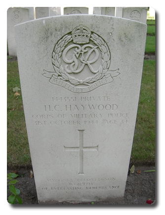 | Notes: | CMP. He was born and resided in Birmingham and formerly served in the Royal Artillery. 15/8/1942 transferred to CMP. Inscription on gravestone: My only beloved son, worthy of everlasting remembrance. Casualty List 1604/13, Western Europe, Killed in Action, date not reported.7/9/49 He was awarded the 1939-1945 Star, France & Germany Star, Defence Medal, War Medal. Address:- 93 Oldr Renshaw Road, Sheldon, Birmingham, Warwickshire. Harry Charles Haywood. |