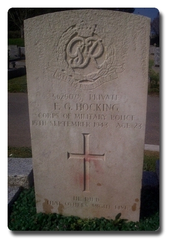 | Notes: | CMP TC. Formerly 11 Devonshire Regiment. 2/8/41 Transferred to the CMP. 15/9/43 Died. He was born and resided in Cornwall. His name is spelt Hucking in Army Roll of Honour. Inscription on gravestone: He died that others might live. Killed on active service. Casualty List 1244/14, Home, died as a result of an accident, 15/9/43. 7/9/49 He was awarded the Defence Medal, War Medal. Address:- Not shown. Frederick George Hocking. |