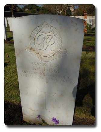 | Notes: | CMP. Formerly Middlesex Regiment. 1/3/41 Transferred to CMP. 9/9/41 Died. He was born in Edinburgh and resided in London. He is also named on the El Alamein Memorial as ME/6203455 Pte. J W Hodge, on column 84 but is buried in Cairo. No inscription on gravestone. Casualty List 761/4, Egypt, Died 9/9/42. Medal card not found. John Wilson Hodge. |