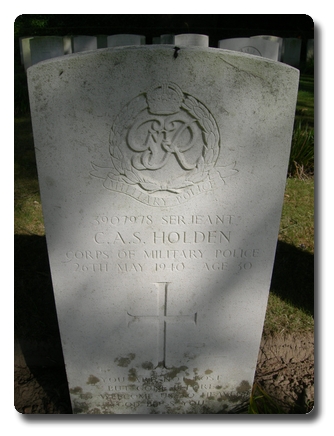 | Notes: | CMP. He was born in London SE and resided in London and formerly served in the South Wales Borderers. Killed in Action when HQ 5 Division was bombed. Info from RMP Journal, 1 quarter page 163. 5 Div Pro Coy War Diary WO 167/253/ 1/6/1940 Capt J Bower, DAPM 5 Division, Company disembark fro Dunkirk successfully but are scattered over the United Kingdom. Casualties were 1 killed, Sgt Holden, 1 wounded L/Cpl Smith, 1 missing, L/Cpl Trueman subsequently reported a a POW.. (See A Dunkirk Story (Part I) by Lt/Col J A T Bower, RMP Journal, 4th quarter, 1962, page 110). Casualty Lists 226/2, BEF France, Killed in Action, date not reported, (26/5/1940), 69. 20/9/48 He was awarded the 1939-1945 Star, War Medal, MID, GSM Palestine. Address:- 1 Council House, Netheravon, Nr. Salisbury, Wilts. Inscription on gravestone: You are not lost but gone before to welcome us in heaven. Charles Arthur Stephen Holden. |