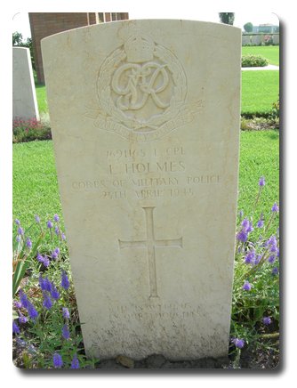 | Notes: | CMP. Enlisted in to CMP. He was born in Northamptonshire and resided in Northampton. Casualty List 1750/10, Italy, Died Result of Accident, 25/4/1945, CL 1758/29. 5/9/49 He was awarded the 1939 - 1945 Star, Africa Star with 8 army clasp, Italy Star, War Medal. Address:- Mr S H Holmes, 11 Rosewood Place, Kettering, Northamptonshire. Inscription on gravestone: He is with us in our thoughts. Leslie Holmes. |