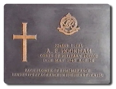 | Notes: | CMP. POW. Singapore Fortress Pro Coy. Enlisted in the Royal Army Service Corps. 4/1/41 Transferred to CMP. 14/5/45 Died, Labuan. He was born in Sheffield and resided in Sussex. Captured 15/2/42 Singapore. Shown as being in Borneo in Cutts Papers. Casualty List 1920, CMP, POW. Previously reported POW now reported Died, date of death 14/5/1945. Info from Japanese POW Index Card: Hookham, Arthur, Ernest, born 26/9/1915, L/Cpl, No. 224889, 3 Indian Corps Pro Coy, captured Singapore 15/2/1943, from Brincliffe Edge, Sheffield, occupation Transport Driver, address: Mrs Kathleen Hookham, 10 Alfred Street, St Leonards on Sea, Sussex. Listed on Allied POW Roll: No. 24975, Hookham, Arthur E, L/Cpl, 224889, captured 15/2/1942, died 14/5/1945, Camp BO (Borneo, Kuching) Deceased. He is listed on British POW's held in Japan or Japanese Occupied Territory: 24874, Hookham, Arthur E, L/Cpl, 224889, Army, captured 15/2/1942, died 14/5/1945, camp BO, Borneo, deceased. He is listed on Deceased Roll of POW's Borneo: 224889, L/Cpl, Hookham, A E, 3 Indian Corps Pro Coy, Died 14/5/1945, Kuching. Casualty List 767/16, Malaya, Missing, 15/2/1942. Casualty List 1435/13, Malaya, previously posted missing now reported POW, previous lists 1149 & 767, 15/2/1942. Casualty List 1149/9, previously reported missing now POW, previous list 767, 15/2/1942, rank L/Cpl. Casualty List 1920/14, CMP, POW. Previously reported POW now reported Died, Malaya, date of death 14/5/1945, previous list 1149, (corrected by 1435, Malaya). Inscription on grave panel: Each flower of remembrance leaves it's fragrance in the heart. Medal card not found. Arthur Ernest Hookham. |