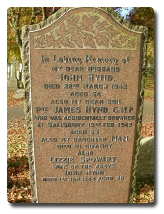 | Notes: | CMP. 18/4/40 enlisted in the Black Watch, 25/1/41 transferred to CMP. 50 Coy TC. 15/2/43 Died. He was born and resided in Dunfermline and formerly served in the Black Watch. 50 Traffic Control Company War Diary, WO 166/13665. 10/3/1943 The Company lost one of it's best soldiers who had been missing since 15/2/1943 today, we regret to state that the body of Pte James Hynd had been found in the river Nadder near the Old Mill, Salisbury where he had been stationed. 11/3/1943 Inquest held on Pte James Hynd, the verdict of accidental death by drowning. Capt C H Owen attended the inquest. Casualty List 1097/17, Home, died as a result of an accident, 15/2/1943. 7/9/49 He was awarded the War Medal. Address:- Mrs M E Hynd, 56 Blair Drive, Dunfermline, Scotland. Inscription on private gravestone: In loving memory of my dear husband John Hynd, died 22nd March 1942, aged 54. Also my dear son Pte James Hynd, CMP who was accidentally drowned at Salisbury, 15th February 1943, aged 23. James Hynd. |