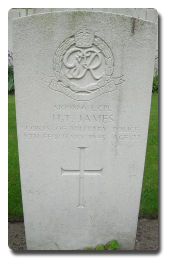 | Notes: | CMP. He was born in resided in Birmingham and formerly served in the Royal Warwickshire Regiment. 51 Div Pro Coy War Diary WO 171/4258. News brought by Sgt Heughan, L/Cpl James killed by a shell - first fatality, 154 Bde Section. Casualty List 1685/9, North West Europe, Killed in Action, 8/2/1945 7/7/49 He was awarded the 1939-1945 Star, Africa Star, with 8 army clasp, Italy Star, France & Germany Star, Defence Medal, War Medal. Address:-. 54 New Hall, Hill Parade, Birmingham 1, Warwickshire. No inscription on gravestone. Harry Thomas James. |