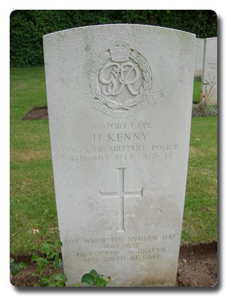 | Notes: | CMP. He enlisted in to CMP. 245 (Beach) Pro Coy. He was born and resided in Leeds and enlisted in CMP. 245 Pro Coy, Unit War Diary WO 171/3390. 11/7/44 Caen, L/cpl Kenny killed by shellfire. Casualty List 1508/18, North West Europe, Died of Wounds, 11/7/44. 20/9/49 He was awarded the 1939-1945 Star, France & Germany Star, Defence Medal, War Medal. Address:- 45 Bayswater Mount, Roundhay Road, Leeds 8, Yorks. Inscription on gravestone: But when the summer day was passed he looked at heaven and smiled at last. Unit landed 6 June, part of 6 Beach Group, 101 Beach Sub-Area. Henry Kenny. |