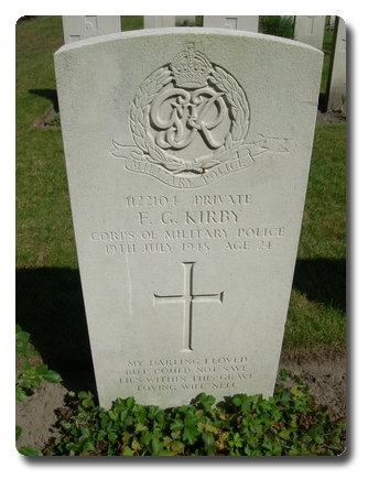 | Notes: | CMP. He was born and resided in London E and formerly served in the Royal Artillery. 28/1/1945 transferred to CMP. Name spelt Kibby in Army Roll of Honour. Inscription on gravestone: My darling I loved but could not save, lies within this grave. Loving wife Nell. Casualty List 1829/8, Western Europe, Died, 19/7/1945. Casualty List 1870/17, Western Europe, Died as a result of an accident, 19/7/1945. Medal card not found. Frederick George Kirby. |