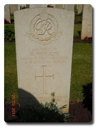 | Notes: | CMP. Enlisted in the Coldstream Guards, 3/1/40 compulsory transfer to CMP. He was born in London and resided in Bradford. Casualty List 208/1, Egypt, Died, 12/5/1940. GSM Palestine. Medal card not found. Inscription on gravestone: In the garden of memories it is always summer. History of the West Riding Constabulary 1856 - 1968 by Jack Alderson, page A28. Formerly PC 1520 West Riding Constabulary who joined the force 4/12/38 having served 4 years in the Coldstream Guards. He died of acute appendicitis. Harold Metcalfe. |