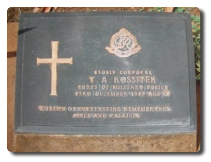 | Notes: | CMP. POW. He was born in Eire and resided in Liverpool and formerly served in the Royal Artillery, 7/7/1940 transferred to CMP. 15/2/1942 captured Singapore. 23/12/43 Died. Shown as died up country in Cutts papers. Inscription on grave panel: Worth of everlasting remembrance, Alice and Patrick. Info from Japanese POW index card: Thomas Rossiter, 25/2./1918 born 8 Convent Hill, Waterford, Eire, address: wife Alice Rossiter, evacuated Singapore, 6/2/42, occupation Bakers Rounds man, father Joseph, mother Hannah. Casualty Roll 765, Malaya Missing 15/2/1942. He is listed on British POW's held in Japan and Japanese Occupied Territory: 43536, Rossiter, Thomas A, L/Cpl, 850819, Army, captured 15/2/1942, died 23/10/1943, camp TH, Thailand. He is listed on Thailand POW Camp Roll, 1/11/1944: Rossiter, Thomas, Army, L/Cpl, new POW No. II13893, old POW No. II 5836, former camp M-7512, 850819, died 18/12/23. He is listed on British POW's who died of illness or aerial bombardment: 73. L/Cpl, Thomas Rossiter, 850819, died 23/12/1943 from indigestion, inhumed. Casualty List 765/13, Malaya, Missing, 15/2/1942. Casualty List 1307/6, Malaya, previously reported Missing now reported POW in Japanese hands, previous list 765, 15/2/1942. Casualty List 1802/42, previously reported POW in Japanese hands now reported died23/12/1943, previous List 1307, Malaya. 7/9/49 He was awarded the 1939-1945 Star, Pacific Star, Defence Medal, War Medal. Address:- 7 Craddock Street, Bolton, Lancs. Thomas Anthony Rossiter. |