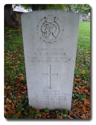 | Notes: | CMP. Enlisted in the Royal Army Service Corps, transferred to the Suffolk Regiment, transferred to CMP. VP. 26/9/41 Died. He was born and resided in Cambridgeshire and formerly served in the Cambridgeshire Regiment in Army Roll of Honour. Inscription on gravestone: Greater love hath no man than this that a man lay down his life for his friends. Born 28/3/1888 Died 26/9/1941. Casualty List 648/5, Died Result of Accident, 26/9/1941. Medal card not found. Charles Edward Seabrook. |