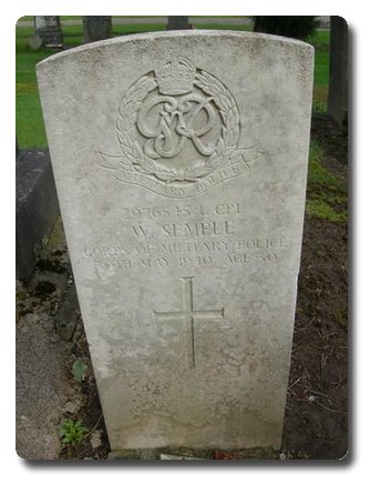 | Notes: | CMP. Enlisted in the Argyll & Sutherland Highlanders, transferred to CMP. 30/5/40 Died. He was born in Renfrewshire and resided in Stirling. No inscription on CWGC stone but there is an open book memorial on the grave which reads: William Semple, died at Shorncliffe from wounds received in the evacuation of Dunkirk, May 30th 1940. From his wife Mollie. Extract from a book "We Remember Dunkirk" memories of Cpl R Blackburn of Newport, Gwent. I patrolled the road south as it was obvious that a heavy battle was going on at Cassell some few miles away. Ambulances would need a clear road. unfortunately no ambulances came through. They were in a convoy which I understand was wiped out by Stukas. I lost Bill Semple on this patrol. He died of wounds in Dover. Casualty List 228/41, Home, Died of Wounds, Ex BEF 30/5/1940, 24. 18/1/50 He was awarded the 1939-1945 Star, War Medal. Address:- 1 Radnor Street, Swindon, Wilts. William Semple. |
