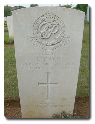 | Notes: | CMP/ 67 Company, TC. He was worn and resided in Liverpool and formerly served in the Loyal Regiment. 67 Company TC Unit War Diary WO 171/ 3367. No mention of deaths in diary. Part I Order, 3/9/1944. 175. Donations & auction, L/Cpl's Senior and Pate. The sum of 15,400 francs (including donations) was raised at the auction of personal kit of the above deceased members of the company. The sum was equally divided and has been made up to 18,000 francs - £90 from PRI account therefore the sum of £45 each will be credited to deceased credits and will be forwarded to deceased next of kin through the paymaster. Casualty Lisyt 1547, North West Europe, Accidentally Killed, 27/8/44. Inscription on gravestone: Worthy of everlasting remembrance. John Senior. |